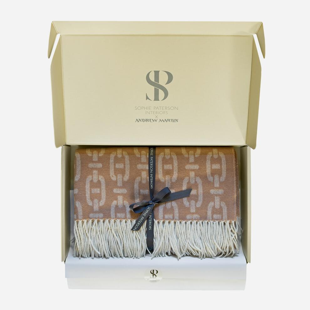 Perfect for adding a chic layer to any bed, sofa or chair this soft and luxurious throw has fringed edges and was woven in Italy from 90% Merino wool and 10% cashmere. In a warm tan shade this throw features our popular Burlington pattern, designed in collaboration with Sophie Paterson and inspired by the grand architecture of Mayfair's Burlington arcade. Each throw comes individually boxed and wrapped in tissue paper with ribbon.
