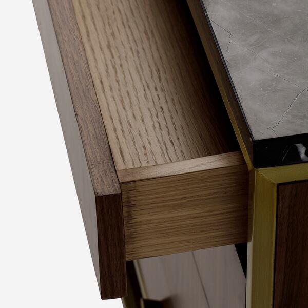 Art Deco style sideboard in dark wood with oak and walnut veneering, satin brass frame and a black marble top.
