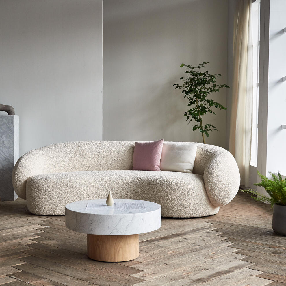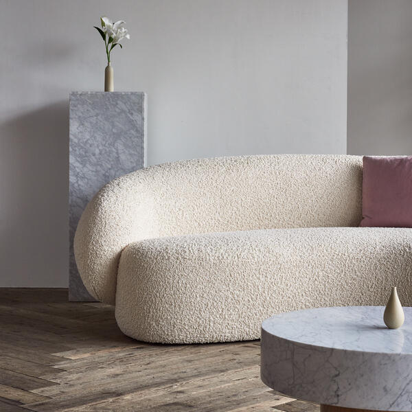 3 Seater sofa upholstered in Boucle material with asymmetrical arm curves.