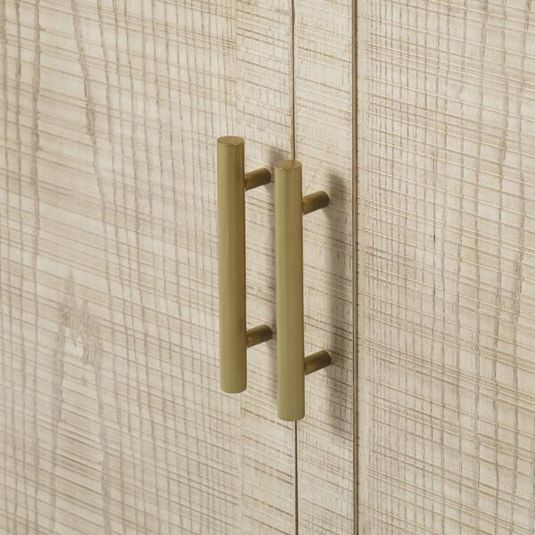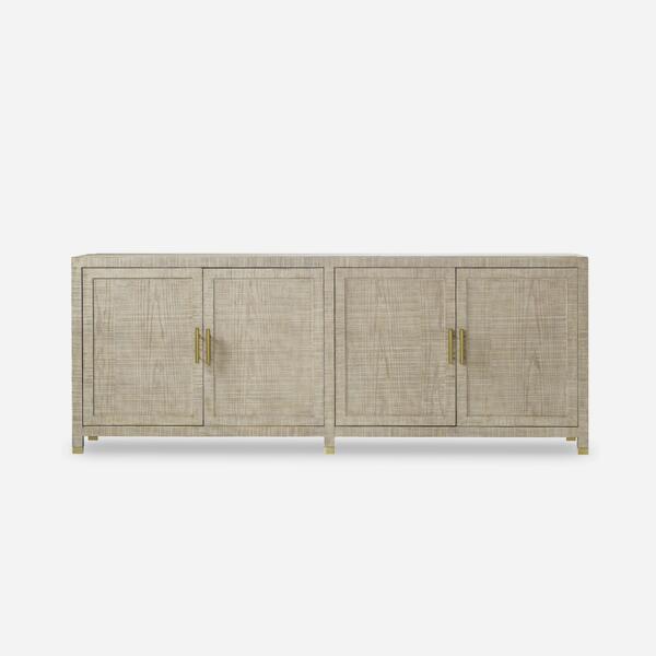 A rustic 4 door sideboard created by ash solids and veneers that give the look of a woven linen fabric, with brass finish handles.