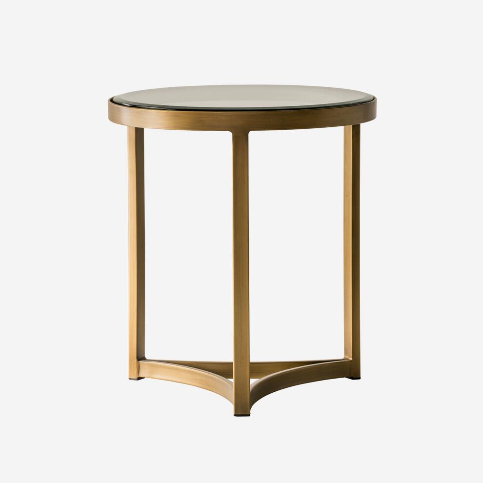 Small round side table with an antique brass finish frame and glass top.