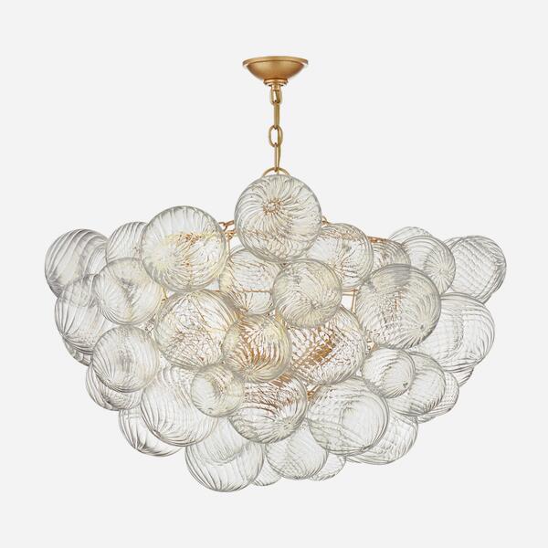 Chandelier formed by artisanal glass orbs and a gilded frame, allowing for 8 bulbs.