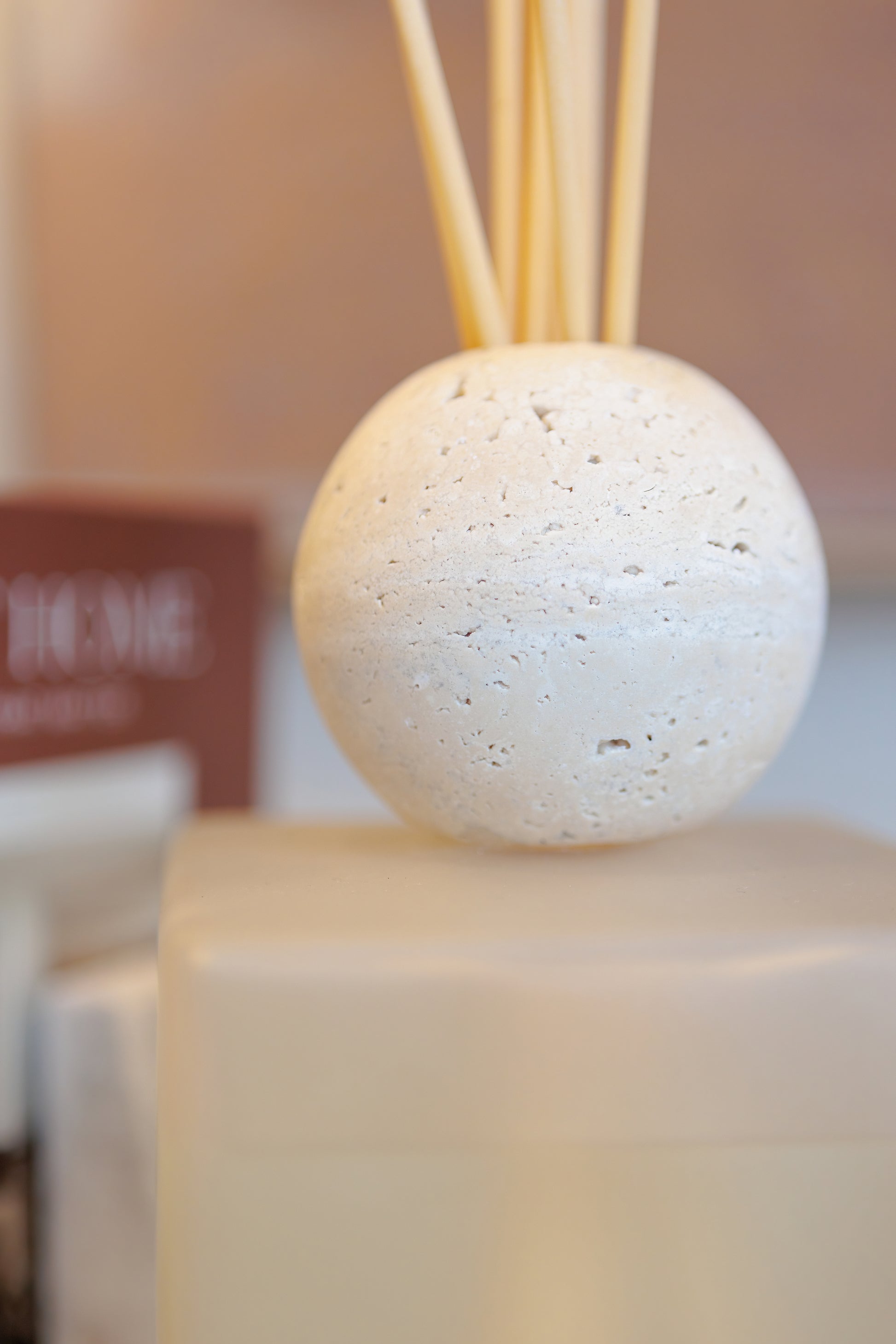 Pink pepper, cedar and patchouli scent in a frosted glass bottle, featuring a travertine lid, with natural wood coloured reeds.