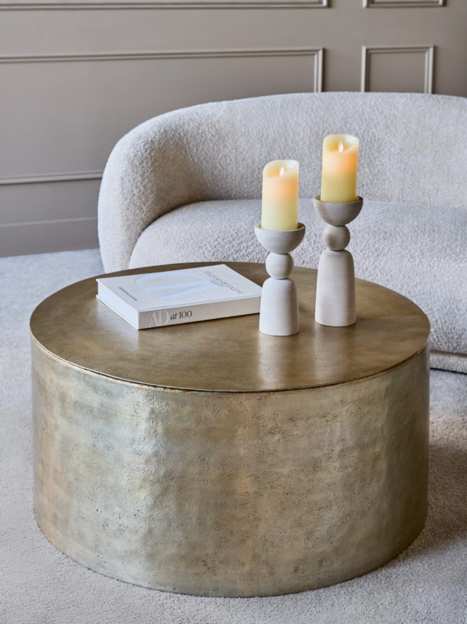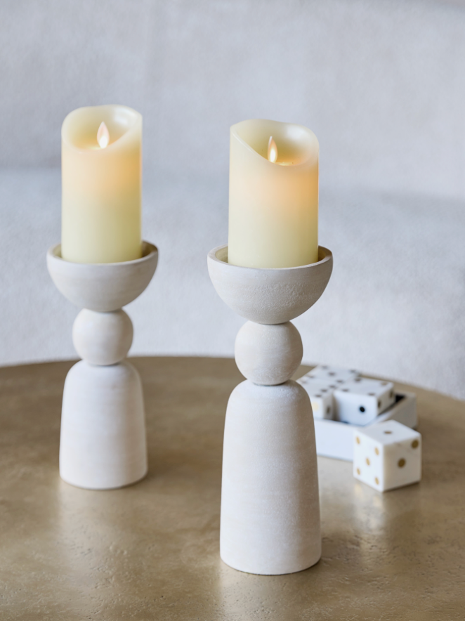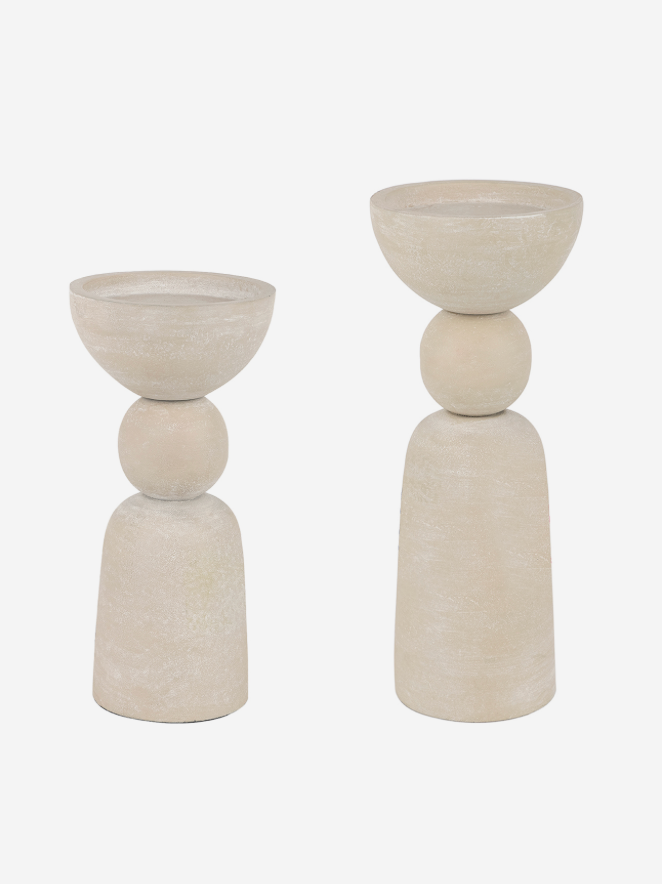 Tall and sculptural, the Van Dyk Ball Putty Centre Pillar Holder in large format lends height and visual weight to a display. Made from aluminium with a putty-toned stonewashed finish, it combines smooth, chalked texture with the warmth of rounded forms. The ball detail and stepped base give the piece a timeless architectural balance, allowing it to anchor a mantel, console or floor display with ease. Designed to hold a pillar candle, it also serves as a standalone decorative object. Intended for indoor use only.